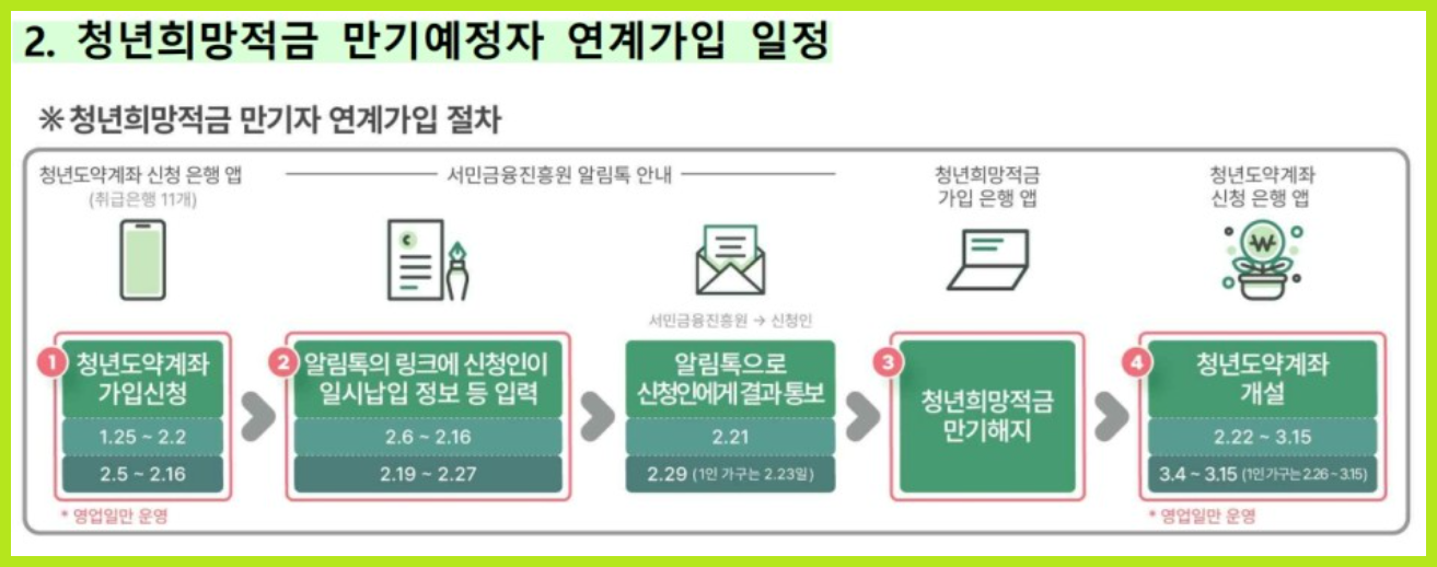 1. 청년희망적금 만기 후 1월 25일부터 2월 16일까지 은행 앱을 통해 청년도약계좌 연계를 신청해야 환승이 가능합니다.