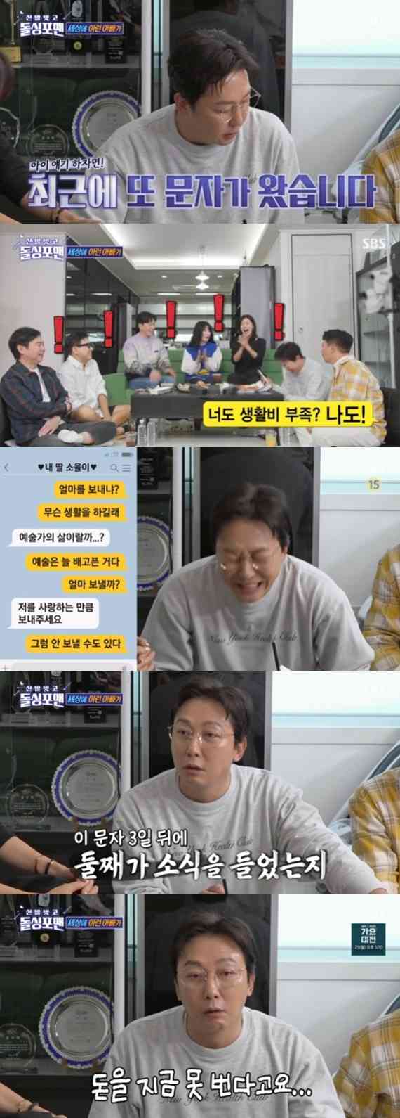 이날 탁재훈은 최근 딸에게 생활비가 부족하다는 문자가 왔다고 운을 떼며 "용돈 준 지 얼마 안 됐다"라고 투덜거리며 특유의 능청스러움으로 재미를 더했습니다.