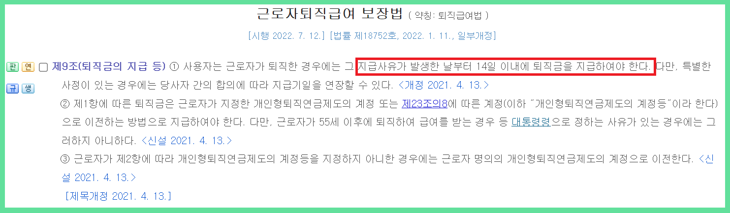 퇴직금 지급 기한은 그 지급사유가 발생한 날부터 14일 이내에 지급되어야 한다고 근로퇴직급여 보장법에 명시되어 있습니다.
