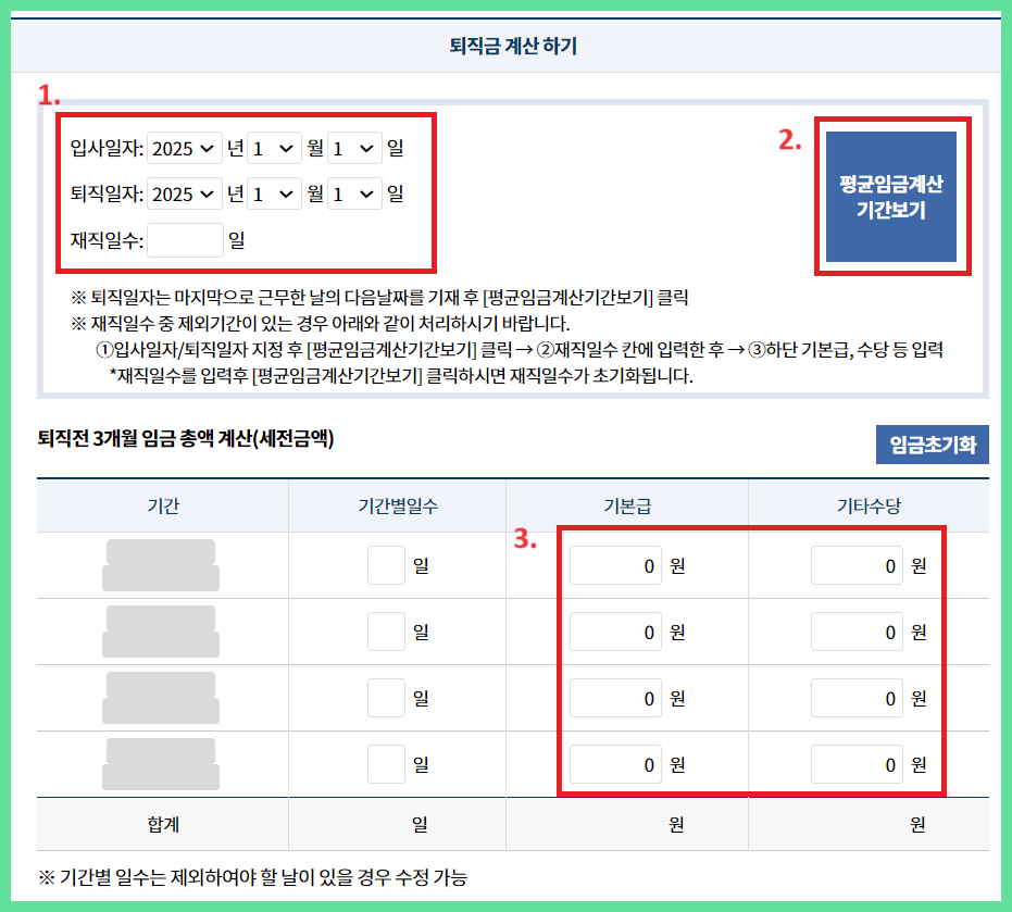 일자를 입력 후 평균임금계산기간보기를 클릭 시 자동으로 재직일수와 퇴직 전 3개월의 기간별 일수가 뜹니다.