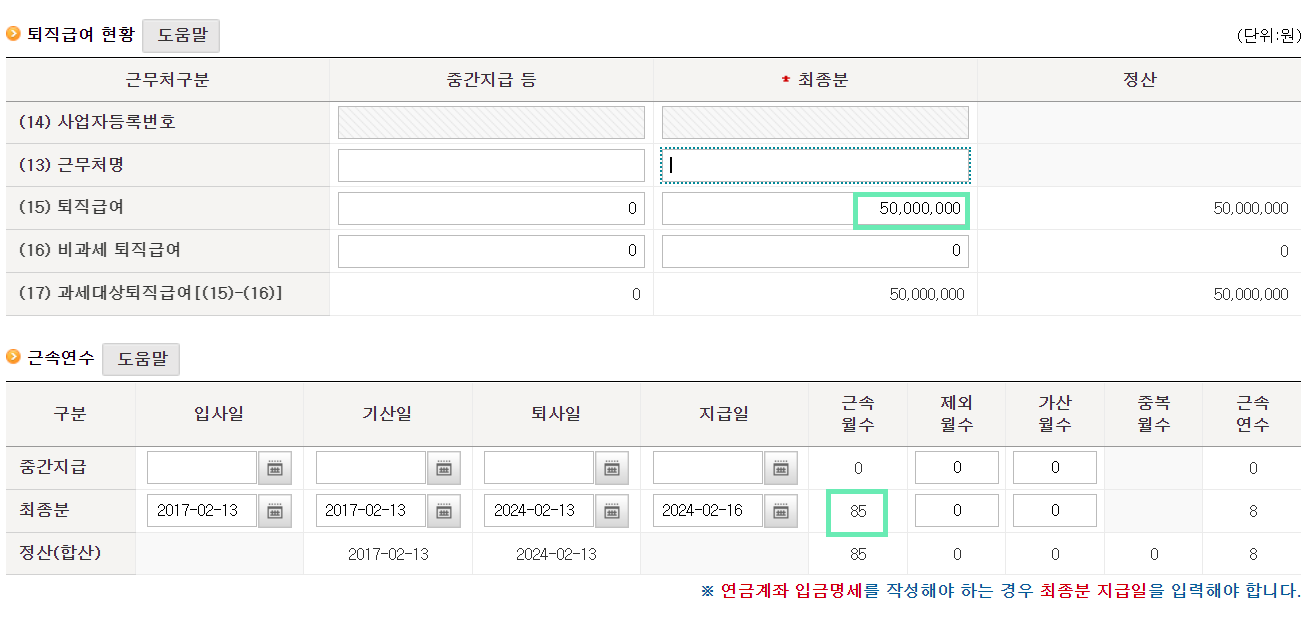 5. 퇴직급여, 입사일, 퇴사일, 기산일 등 입력 (ex 퇴직급여: 5천만원, 근속월수: 85 설정)
