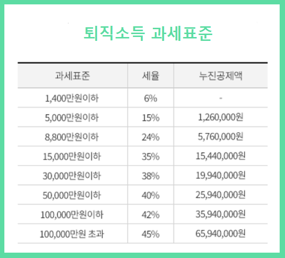 퇴직금은 근속연수에 따라 과세표준 금액이 결정되고 과세표준에 따라 세율이 달라집니다.