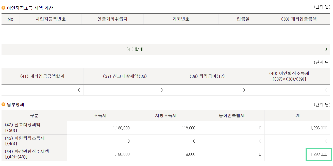 소득세와 지방소득세를 합한 총 1,298,000원이 퇴직소득세로 산출되었습니다.