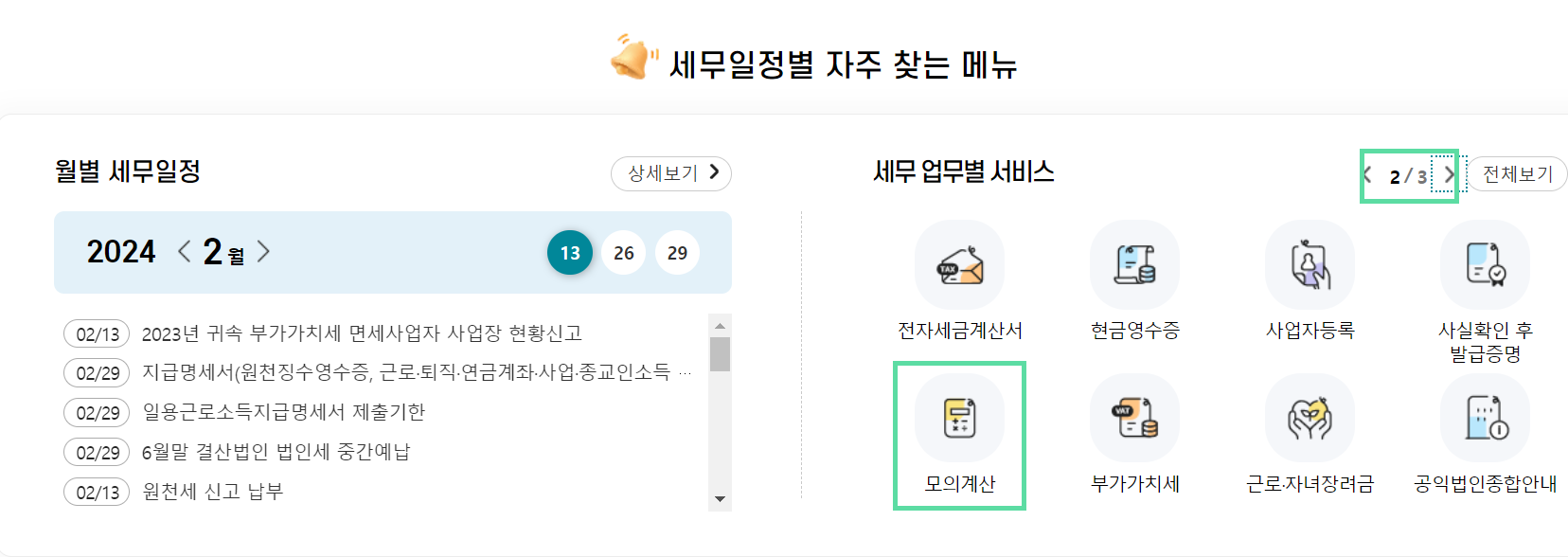 2. 세무 업무별 서비스에서 모의계산 클릭