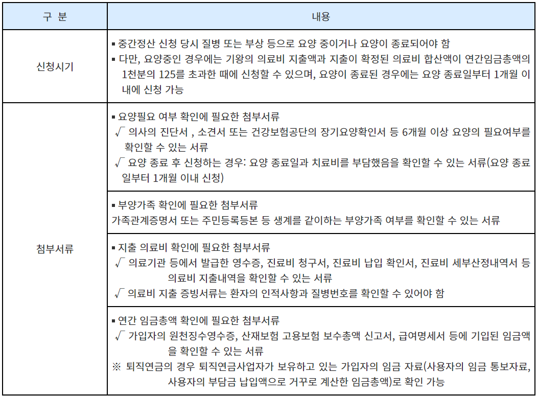 ·의사 진단서, 소견서, 장기요양확인서 등 6개월 이상 요양이 필요하다는 것을 확인할 수 있는 서류