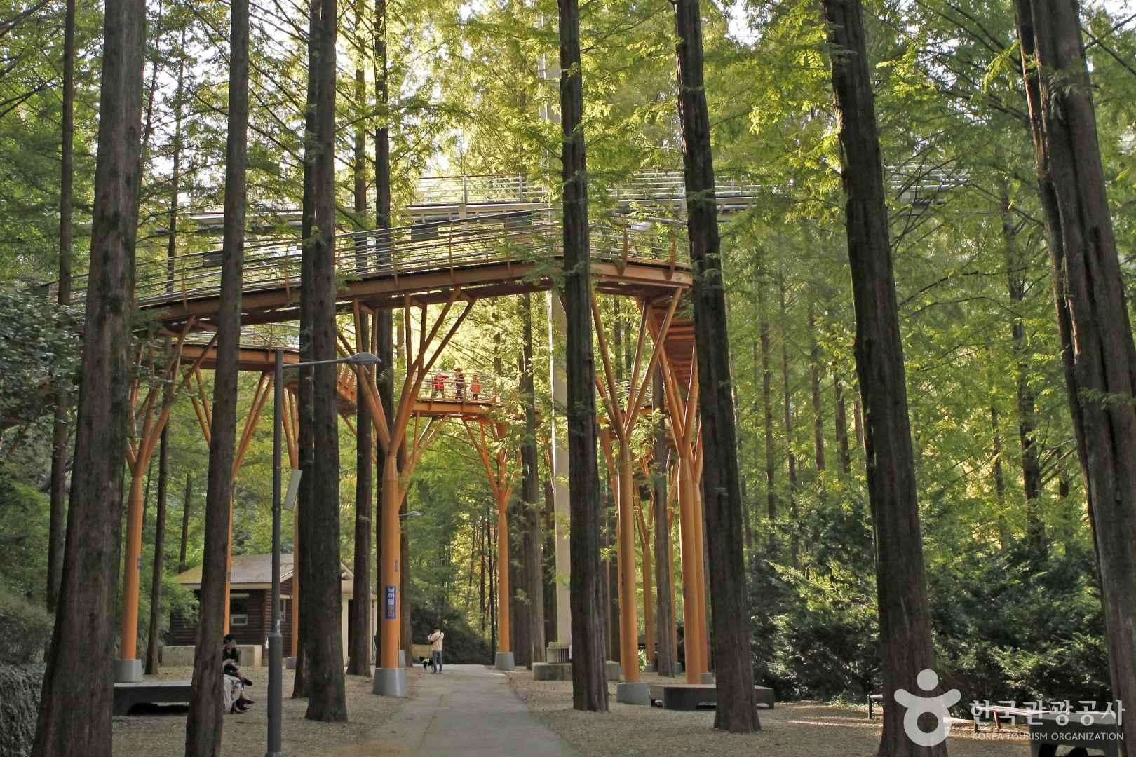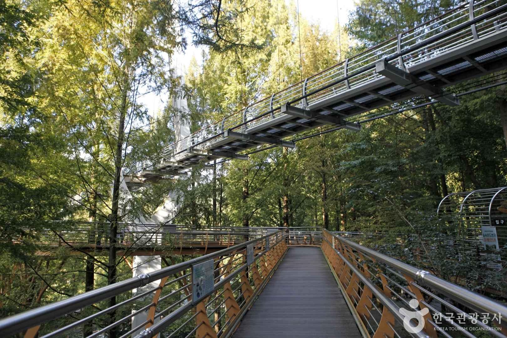 이곳의 하이라이트는 스카이웨이와 스카이타워입니다. 지상 10~16m 높이에 설치된 스카이웨이를 걸으면 메타세쿼이아의 중간 즈음을 눈높이로 감상할 수 있어요. 그 끝에 있는 27m 높이의 스카이타워에 오르면 메타세쿼이아 꼭대기와 눈을 맞출 수 있답니다. 아찔하지만 환상적인 경험이 될 거예요.