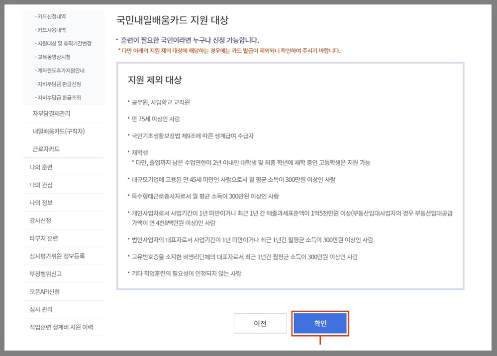2. 국민내일배움카드 발급절차 안내를 확인 후 아래에 '다음' 클릭→ 국민내일배움카드 지원 제외 대상 여부를 체크한 후 확인 클릭