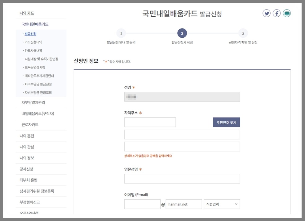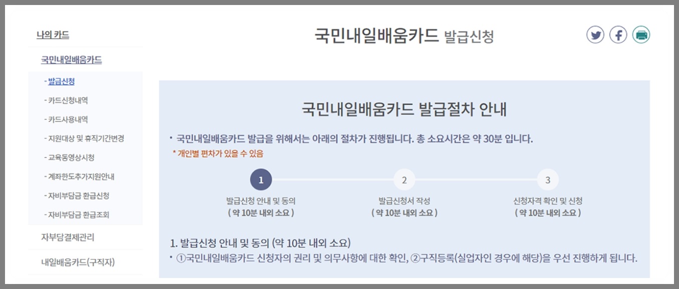 1. 직업훈련포털 HRD-Net (https://www.hrd.go.kr)에서 회원가입 후 '국민내일배움카드 발급신청'을 클릭
