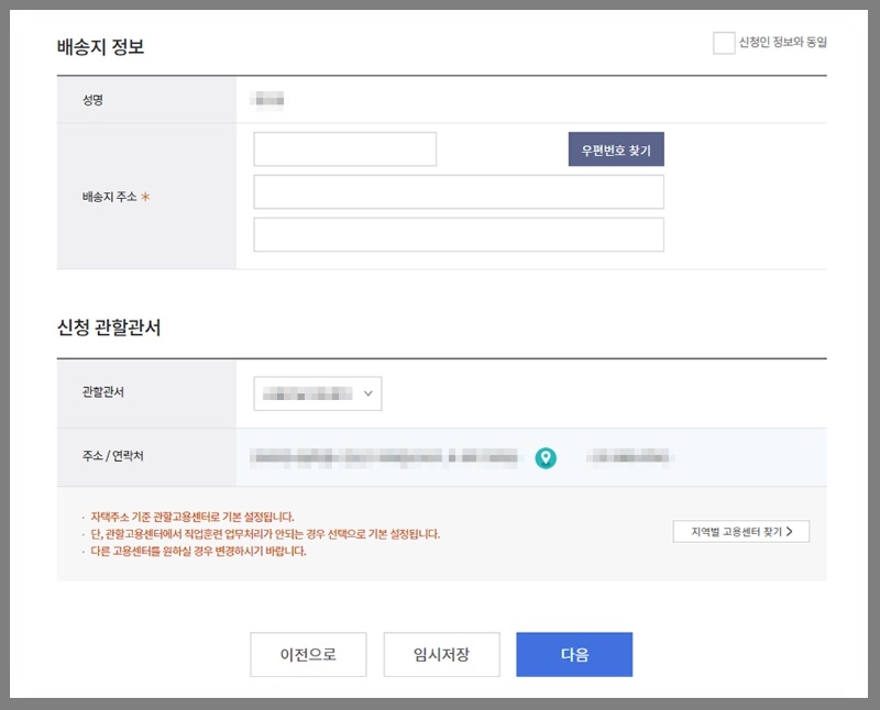 신청인정보, 실물카드정보, 지원대상, 카드배송지정보 등을 입력한 후 신청하면 내일배움카드 발급신청이 완료됩니다.