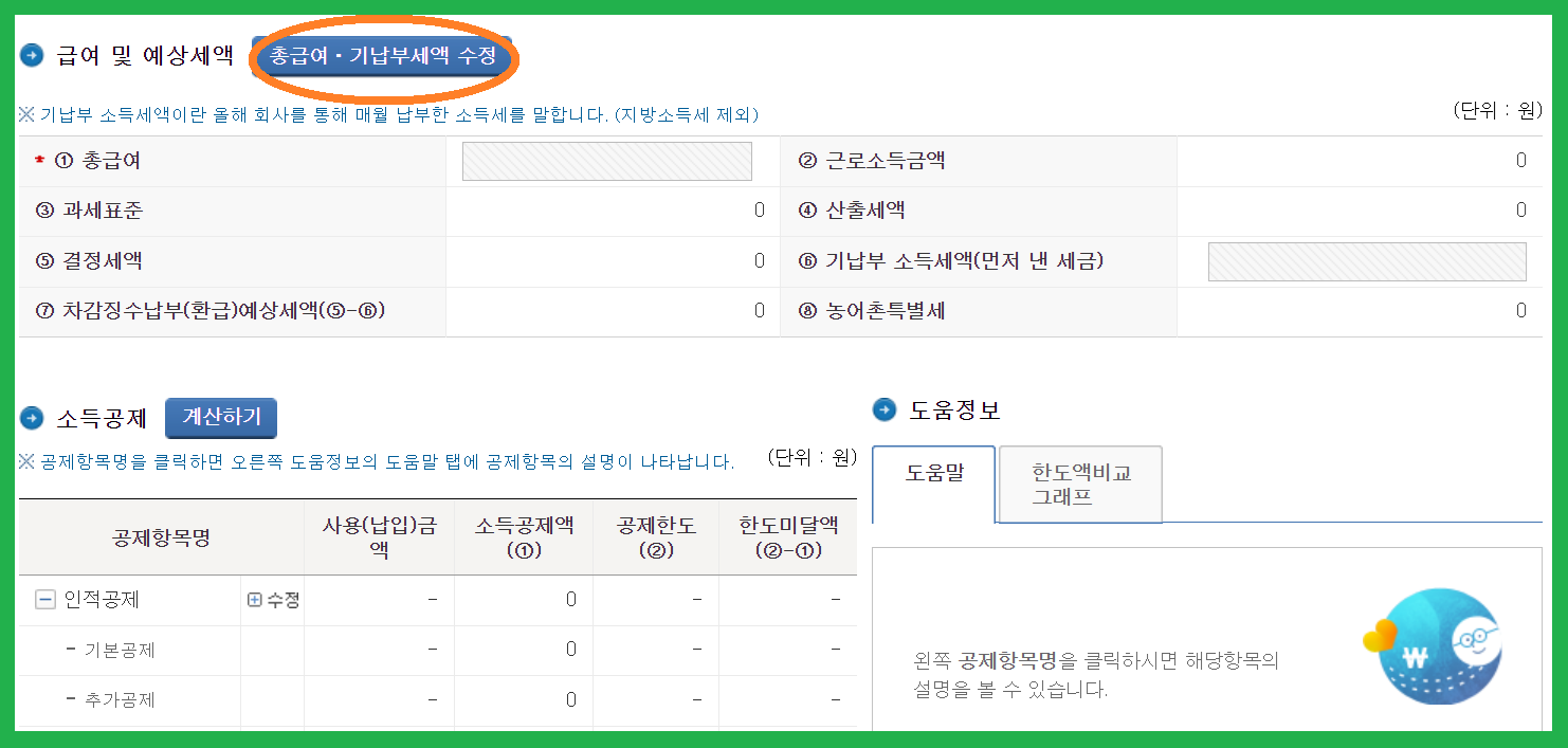 5. 급여 및 예상세액에서 총급여·기납부세액 수정 클릭