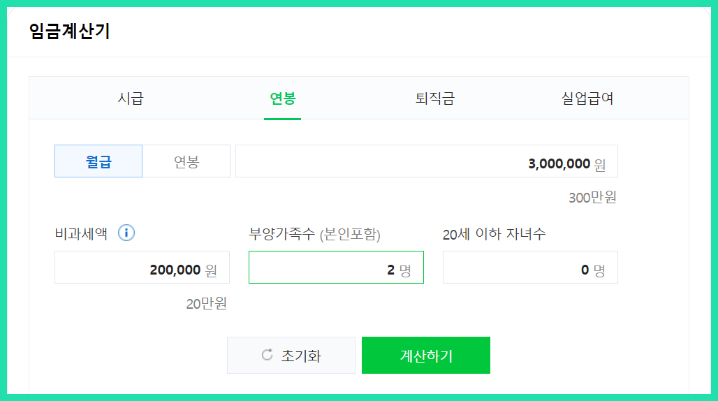 월급과 부양가족수를 입력 후 계산하기 클릭