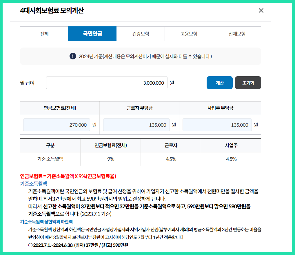 계산 결과 국민연금, 건강보험, 고용보험 등 각각의 보험료를 확인하실 수 있습니다.