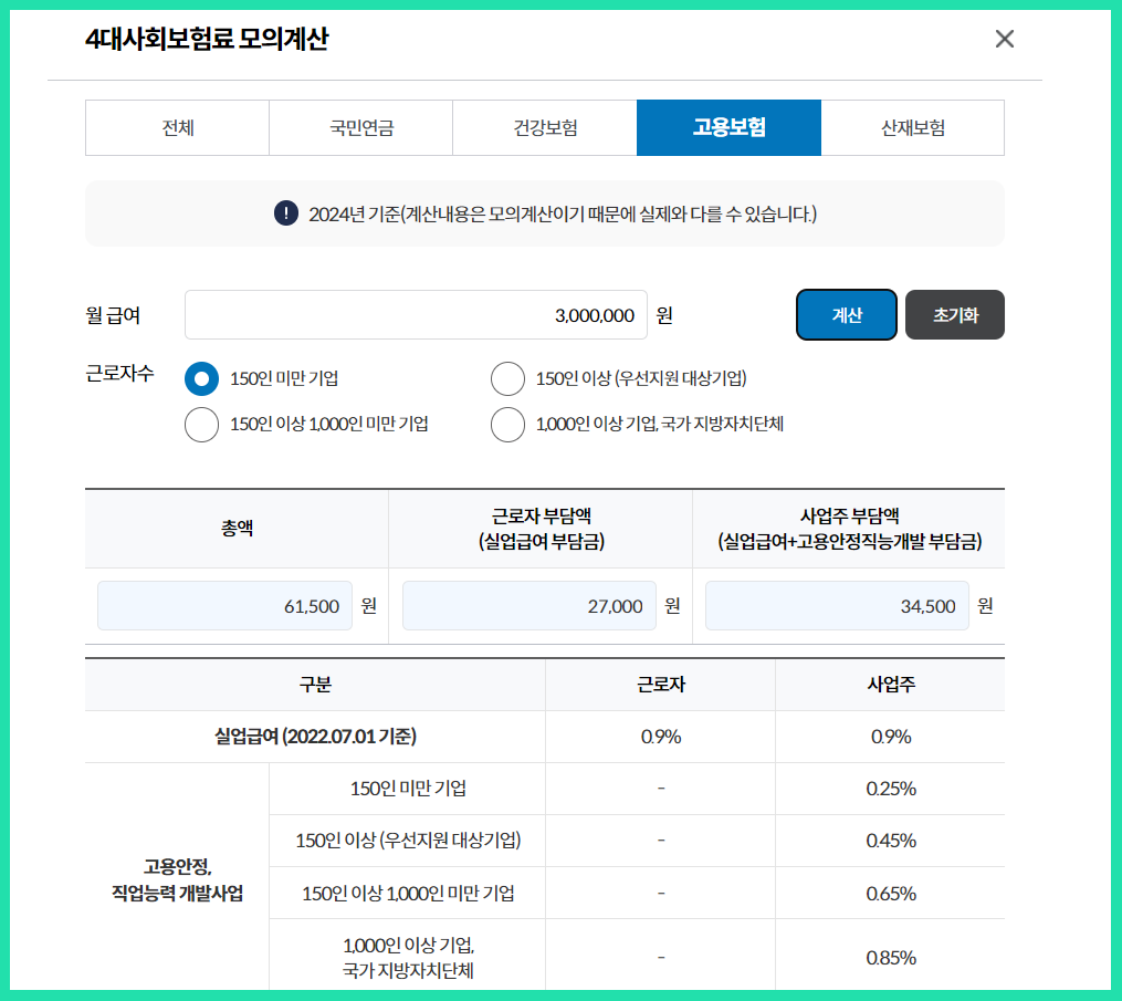 월급여액 300만원, 근로자수 150인 미만으로 설정하여 계산해봤습니다.